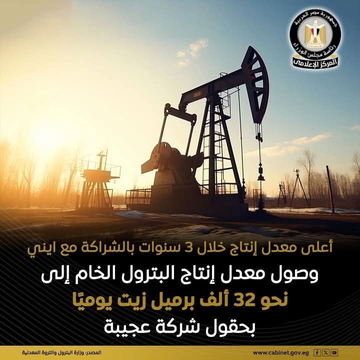متابعة القراءةوصول معدل إنتاج البترول الخام إلى نحو 32الف برميل زيت يومياََ لحقول شركة عجيبة امل كمال حققت شركة عجيبة نتائج متميزة في مجال الإنتاج لشهر ديسمبر الجاري، حيث بلغ معدل إنتاج البترول الخام نحو 32 ألف برميل زيت يوميًا، وهو أعلى معدل إنتاج حققته الشركة خلال السنوات الثلاث الأخيرة.
