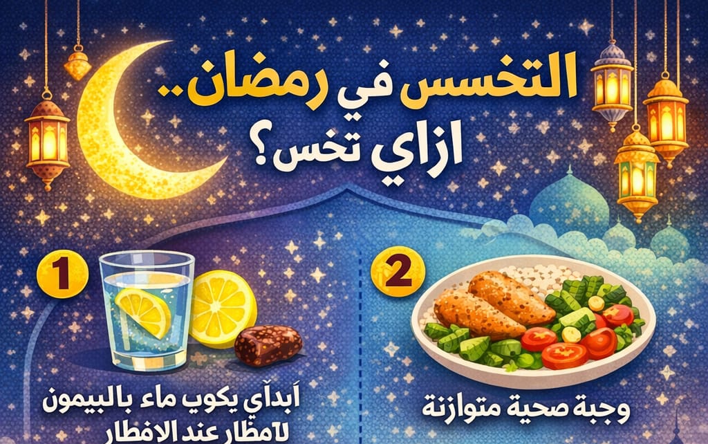 🌙 التخسيس في رمضان.. ازاي تخس وتستفيد من الشهر الكريم رمضان فرصة ذهبية لتنظيم جسمك وتخس بطريقة صحية، مش بس صيام عن الأكل والشرب، لكن كمان فرصة تتحكم في أكلك وعاداتك اليومية. 1️⃣ حضري نفسك صح قبل الإفطار ابدأي بشرب كوب مياه دافي مع عصرة ليمون 🍋 قبل أي حاجة،
