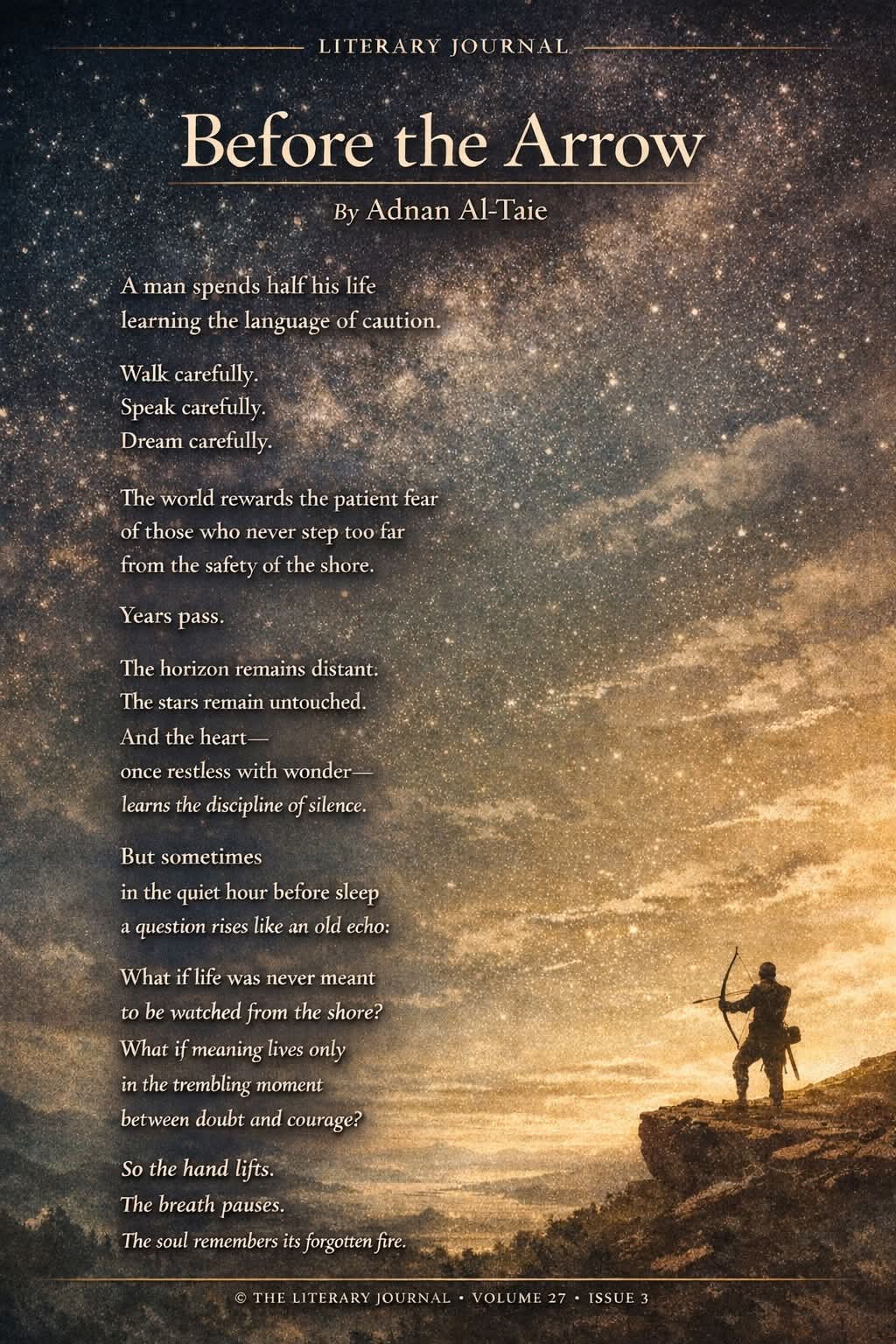 قراءة نقدية أدبية للقصيدة قبل أن يُطلق السَّهم بقلم الباحث والكاتب والناقد: عدنان مهدي الطائي يمكن قراءة القصيدة كالشعر النثري (Before the Arrow) بوصفها نصًا تأمليًا ينتمي إلى ما يُعرف في الأدب التأملي (Meditative Prose Poetry)، حيث لا يعتمد النص على الإيقاع الوزني بقدر ما يعتمد على الإيقاع الفكري والصورة