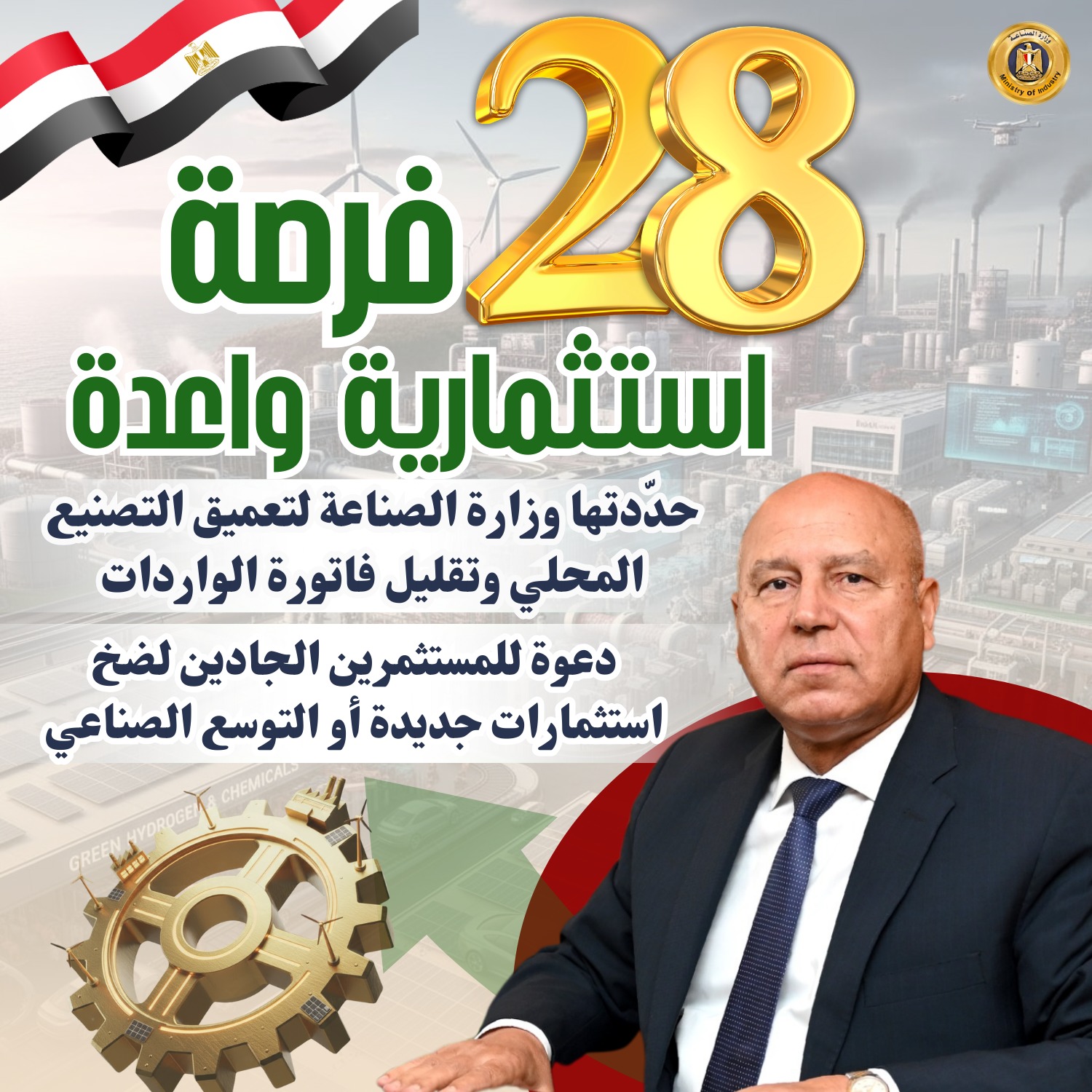 الفريق كامل الوزير 28 فرصة استثمارية واعدة المحددة من وزارة الصناعة بهدف تعميق التصنيع المحلي كتبت رشا محمدي الوزارة تدعو المستثمرين الجادين لضخ استثمارات جديدة أو التوسع في هذه الصناعات الواعدة والمستهدفة لتقليل فاتورة الواردات توافر الطاقة والخامات الاولية والعمالة الفنية ذات الأجور التنافسية وتكنولوجيا الإنتاج واحتياجات السوق حددت