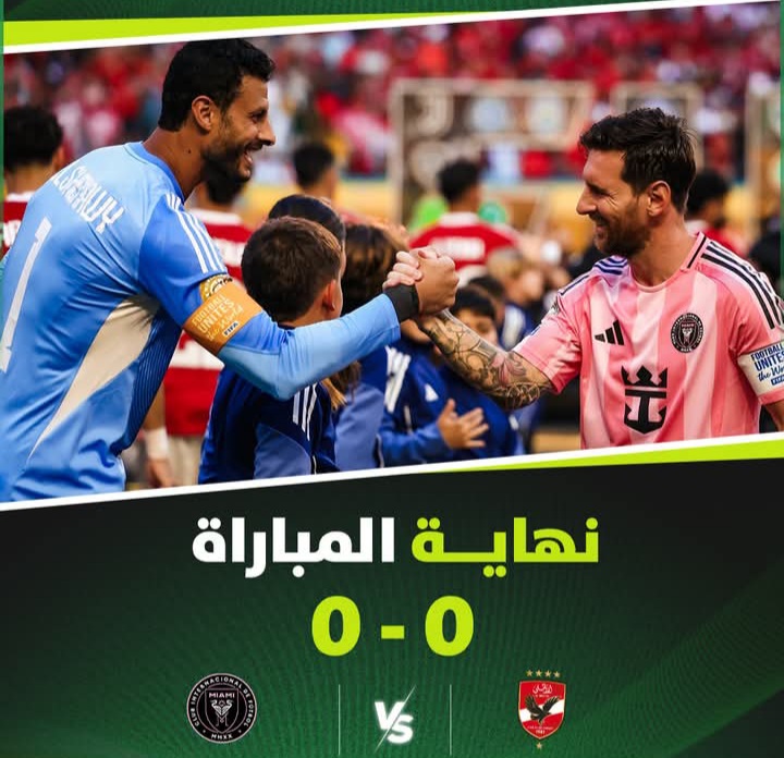 الأهلي يلعب شوطا عالميا ويتعادل أمام ميامي ويمنح مليون دولار ناصر العشماوي فاجأ الأهلي في الشوط الأول من مباراته الافتتاحية أمام إنتر ميامي الجميع بمستوى فني عال للغاية وأداء يرتقي إلى الأداء العالمي لكنه أهدر عدة فرص محققة وضربة جزاء كانت كفيلة بأن تجعله يحقق الانتصار أمام ميسي ورفاقه .