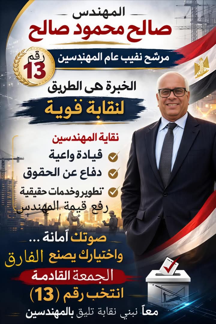 نحو نقابة قوية… ومهندس مُكرَّم صالح محمود صالح يطرح برنامجًا انتخابيًا شاملًا لإعادة الاعتبار لمهنة الهندسة   كتبت / إيمى جبر     في توقيت بالغ الحساسية تمر به مهنة الهندسة في مصر، أعلن المهندس صالح محمود صالح، المرشح لمنصب نقيب المهندسين رقم 13، عن برنامجه الانتخابي تحت شعار: «نحو