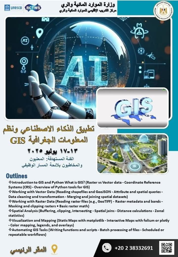 كتب علاء خلاف يعلن مركز التدريب الإقليمي للموارد المائية والري عن عقد البرنامج التدريبى "تطبيقات الذكاء الاصطناعي ونظم المعلومات الجغرافية GIS"، وذلك خلال الفترة من ١٣-١٧ يوليو ٢٠٢٥ بالمقر الرئيسى لمركز التدريب بمدينة ٦ أكتوبر وتتضمن محاور البرنامج : ❇️ Introduction to GIS and Python-What is GIS? (Raster vs