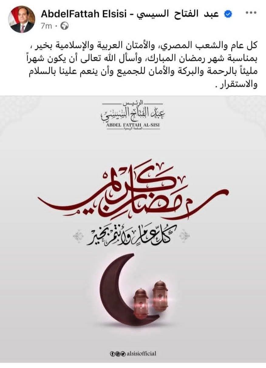 الرئيس السيسي يهنئ الشعب المصري والأمتان العربية والإسلامية بمناسبة شهر رمضان امل كمال هنأ الرئيس عبدالفتاح السيسي، الشعب المصري، والأمتين العربية والإسلامية بمناسبة شهر رمضان المبارك. وقال الرئيس السيسي - في تدوينة له على صفحته الرسمية على موقع التواصل الاجتماعي "فيسبوك" - "كل عام والشعب المصري، والأمتان العربية والإسلامية بخير