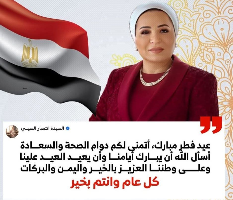 متابعة القراءةانتصار السيسى: أسأل الله أن يعيد العيد علينا وعلى وطننا العزيز بالخير واليمن والبركات امل كمال تقدمت انتصار السيسى، قرينة رئيس الجمهورية، بالتهنئة بمناسبة حلول عيد الفطر المبارك. وكتبت انتصار السيسى، عبر صفحتها الرسمية بموقع التواصل الاجتماعى "فيس بوك":"عيد فطر مبارك، أتمنى لكم دوام الصحة والسعادة. أسأل الله أن يبارك