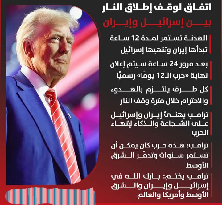 عاجل : ترامب يعلن انتهاء الحرب بين إسرائيل وإيران ناصر العشماوي نشر الرئيس الأمريكي، دونالد ترامب، اليوم الثلاثاء، عبر حسابه الشخصي مفاجأة مدوية للعالم حيث أعلن عن التوصل لاتفاق وقف إطلاق النار بين إيران وإسرائيل بشكل كامل وشامل في غضون 24 ساعة وقال ترامب، عبر حسابه على منصته «تروث