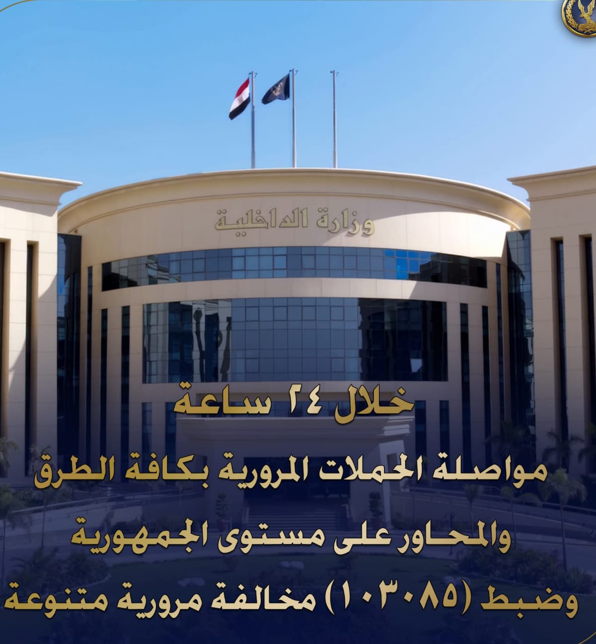 متابعة القراءةعاااااااجل وزارة الداخلية تواصل حملاتها المرورية بكافة الطرق والمحـاور على مستوى الجمهورية كتب نزية عتيق وتتمكن خلال 24 ساعة من ضبط (103085) مخالفة مرورية متنوعة أبرزها :(السير بدون تراخيص - تجاوز السرعة المقررة- موقف عشوائى - التحدث فى الهاتف المحمول أثناء القيادة– مخالفة شروط التراخيص).. وفحص عدد (2100)