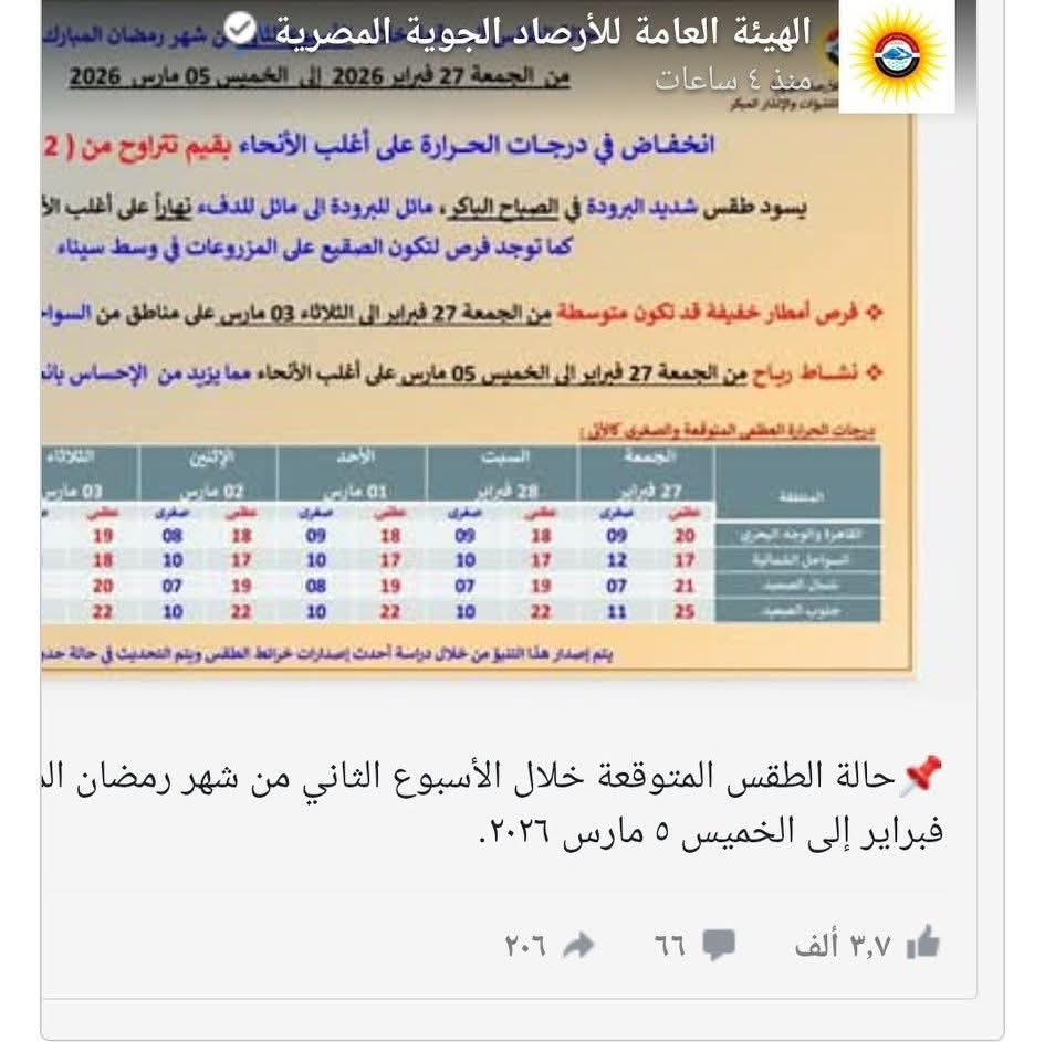 تفاصيل حالة الطقس في مصر حتى 5 مارس 2026 امل كمال كشفت الهيئة العامة للأرصاد الجوية عن تفاصيل حالة الطقس والظواهر الجوية المتوقعة، محذرة من تقلبات جوية تشمل انخفاضاً في درجات الحرارة وفرصا لسقوط الأمطار، بالتزامن مع الأسبوع الثاني من شهر رمضان المبارك لعام 2026. حالة الطقس غدا الخميس 26