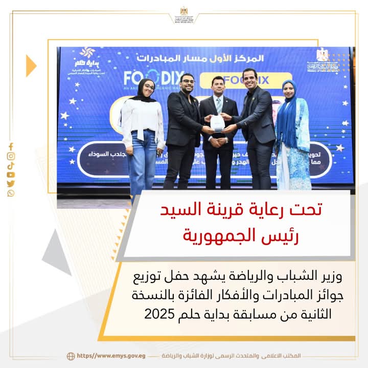 شهد الدكتور اشرف صبحي وزير الشباب والرياضة، حفل توزيع الجوائز لاصحاب المبادرات والأفكار الفائزة بالنسخة الثانية من مسابقة بداية حلم 2025، والتي تقام تحت رعاية السيدة انتصار السيسي قرينة السيد رئيس الجمهورية.