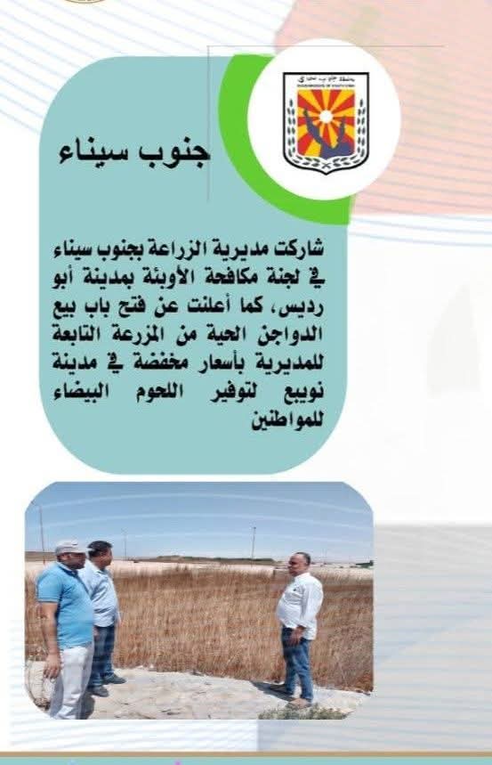 وواصلت مديرية الزراعة بشمال سيناء، أعمال مكافحة الآفات، فضلا عن متابعة الزراعات والمزرعة الإرشادية بالعريش، كما أعلنت مديرية الطب البيطري عن استمرار أعمال التحصين ضمن الحملة القومية ضد الحمى القلاعية، كما شاركت مديرية الزراعة بجنوب سيناء في لجنة مكافحة الأوبئة بمدينة أبو رديس، كما أعلنت عن فتح باب بيع الدواجن الحية من المزرعة التابعة للمديرية بأسعار مخفضة في مدينة نويبع لتوفير اللحوم البيضاء للمواطنين.
