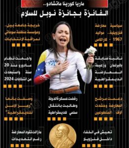 وقالت اللجنة في بيانها إن ماتشادو، التي تعد زعيمة حركة الديمقراطية في فنزويلا، تمثل أحد أبرز الأمثلة على الشجاعة المدنية في أمريكا اللاتينية في السنوات الأخيرة.