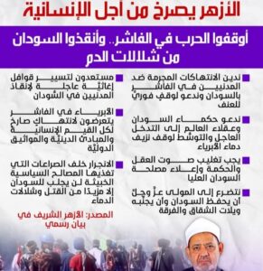 ويُذكِّر الأزهر هؤلاء المعتدين بأنَّ من يقتلونهم هم إخوتهم من السودانيين الذين يشاركونهم الدين والوطن والعرق، وأنَّ الانجرار خلف الصراعات التي تغذيها المصالح السياسية الخبيثة لن يجلب للسودان إلا مزيدًا من القتل وشلالات الدماء التي لا تتوقف، والتخلُّف والفقر، والكراهية والتعصُّب، وتحقيق أجندات خارجية لا تسعى إلا لإضعاف هذا البلد العزيز، والسيطرة على موارده وسرقة خيراته، ووضعه في قائمة الدول التي تعاني من أزمات لا نهاية لها.