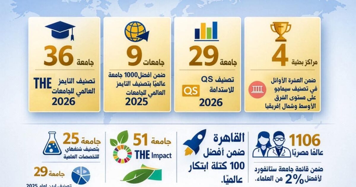 حيث حققت الجامعات المصرية خلال هذا العام تقدمًا ملحوظًا في مختلف التصنيفات الدولية المرموقة، بما يعكس تطور منظومة التعليم العالي والبحث العلمي، والجهود المؤسسية المبذولة لتحسين جودة التعليم، وتعزيز الإنتاج البحثي، ورفع القدرة التنافسية للجامعات المصرية على المستويين الإقليمي والدولي، وذلك في إطار تنفيذ أهداف رؤية مصر للتنمية المستدامة 2030، وتوجيهات القيادة السياسية بالارتقاء بترتيب الجامعات المصرية والمؤسسات البحثية وتعزيز تنافسيتها عالميًا، لدعم توجه الدولة لاستثمار مكانة مصر كوجهة تعليمية إقليميًا ودوليًا، وتعزيز حضورها على خريطة المعرفة العالمية.