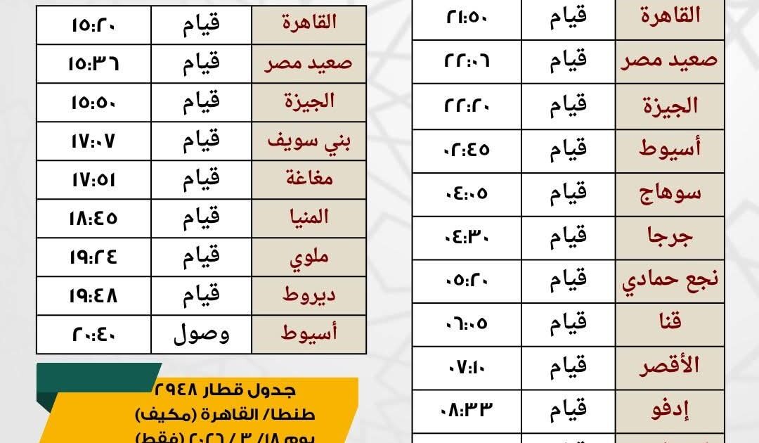 اولا : يوم الثلاثاء الموافق 3/17/ 2026 فقط يتم تشغيل قطار مخصوص مكيف رقم 1954 بين االقاهرة / اسيوط ليقوم من القاهرة الساعة 15:20ويصل اسيوط الساعة 20:40 طبقا للجدول المرفق