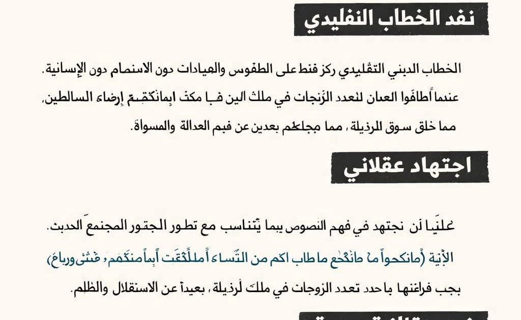 الاجتهاد المفتوح يعني إعادة قراءة النصوص الشرعية بما يتوافق مع التطور الفكري والاجتماعي، دون إلغاء الأحكام أو التحريف، مع مراعاة الغاية الأصلية من التشريع. هذا النهج يسمح لنا بفهم النصوص الدينية في سياقها الأخلاقي والاجتماعي، واستخدامها كأدوات لتنظيم المجتمع، وليس كأوامر جامدة تخضع للأهواء الفردية أو السلطة السياسية. مثال واضح على ذلك هو موضوع تعدد الزوجات و”ملك اليمين”. القراءة التقليدية جعلت من النصوص ذريعة لاستغلال السلطة والمصالح الشخصية، بينما الاجتهاد العقلاني يضع هذه الممارسة ضمن قيود واضحة، حفاظًا على العدالة والكرامة الإنسانية، وتجنبًا لانحرافات اجتماعية مثل الدعارة أو استغلال الفقراء. إعادة ترتيب النصوص لغويًا وأخلاقيًا، مثل: “فأنكحوا ما طاب لكم من النساء أو ما ملكت أيمانكم مثنى وثلاث ورباع” يمكن أن يحقق الهدف من التشريع، ويضمن التوازن بين العقل والغرائز، ويبعد أي تناقض اجتماعي أو أخلاقي.