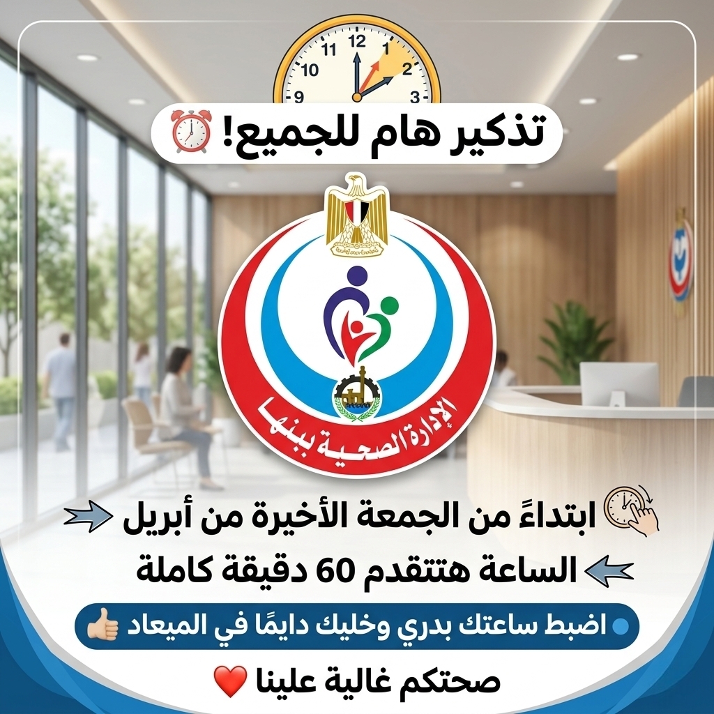 تنويه هام الاداره الصحيه ببنها..... صحتكم غاليه علينا. كتب. باسم الصياد يتقدم مدير الاداره الصحيه ببنها الدكتور بكري سعيد والدكتوره نشوى السنوسي مدير التفتيش الصيدلي في اطار التطبيق التوقيت الصيفي تاهب الاداره الصحيه ببنها بالساده العاملين والمواطنين ضروره الانتباه لتعديل الساعه لا تنسوا ضبط ساعتكم ابتداءا من الجمعه الاخيره