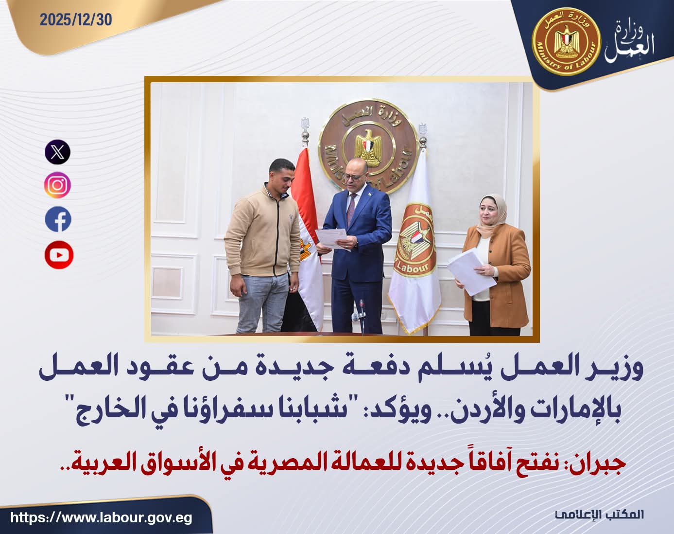 جبران: نفتح آفاقاً جديدة للعمالة المصرية في الأسواق العربية.. عبده الشربيني حمام سَلّم وزير العمل السيد/ محمد جبران، اليوم بمقر الوزارة، دفعة جديدة من عقود العمل لعدد من الشباب المصريين الذين وقع عليهم الاختيار للعمل في دولتي الإمارات العربية المتحدة والمملكة الأردنية الهاشمية، وذلك ضمن سلسلة من الفرص